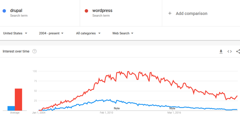 WordPress and Drupal both started in the early 2000s. WordPress in 2003 and Drupal in 2001. Both are open source and supported by their respective communities. They both use a LAMP tech stack. But, in the last two decades, WordPress has been far more popular than Drupal. WordPress has 28 million installs. Drupal has around 600,000. Even looking at the two in Google trends shows how WordPress has grown faster and remained more popular than Drupal.